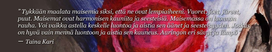 Taina Kari on Tampereen Tammelassa asuva 40-vuotias kehitysvammainen kuvataiteilija, joka on aloittanut taidetunnit Wärjäämön taideverstaalla vuonna 2006. Tainan maalausten aihealueet ovat monipuoliset, mutta varsinkin maisemat ovat hänen ominta alaa. Wärjäämön opissa Tainalle on syntynyt selvä oma tyyli ja siveltimen jälki ja hän on erityisen taitava värien käytössä. Taiteen lisäksi Taina on ahkera opiskelemaan myös muita aloja. Erityisenä kiinnostuksen kohteen ovat historia, arkkitehtuuri ja arkeologia.